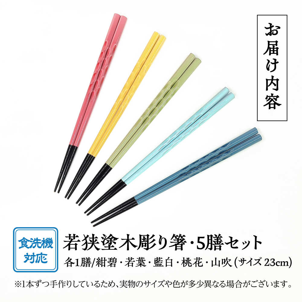 - 【ふるさと納税】若狭塗箸【食洗機対応】持ちやすい木彫り箸 にっぽんの伝統色5膳セット 日本製 箸 伝統工芸品 日用品 食洗器 木彫り 木 若狭塗 天然 おしゃれ カラフル 新年 新しいお箸 新生活 新生活準備 5色 塗り箸 抗菌 国産 送料無料 [Y-089002] [BFCL003]