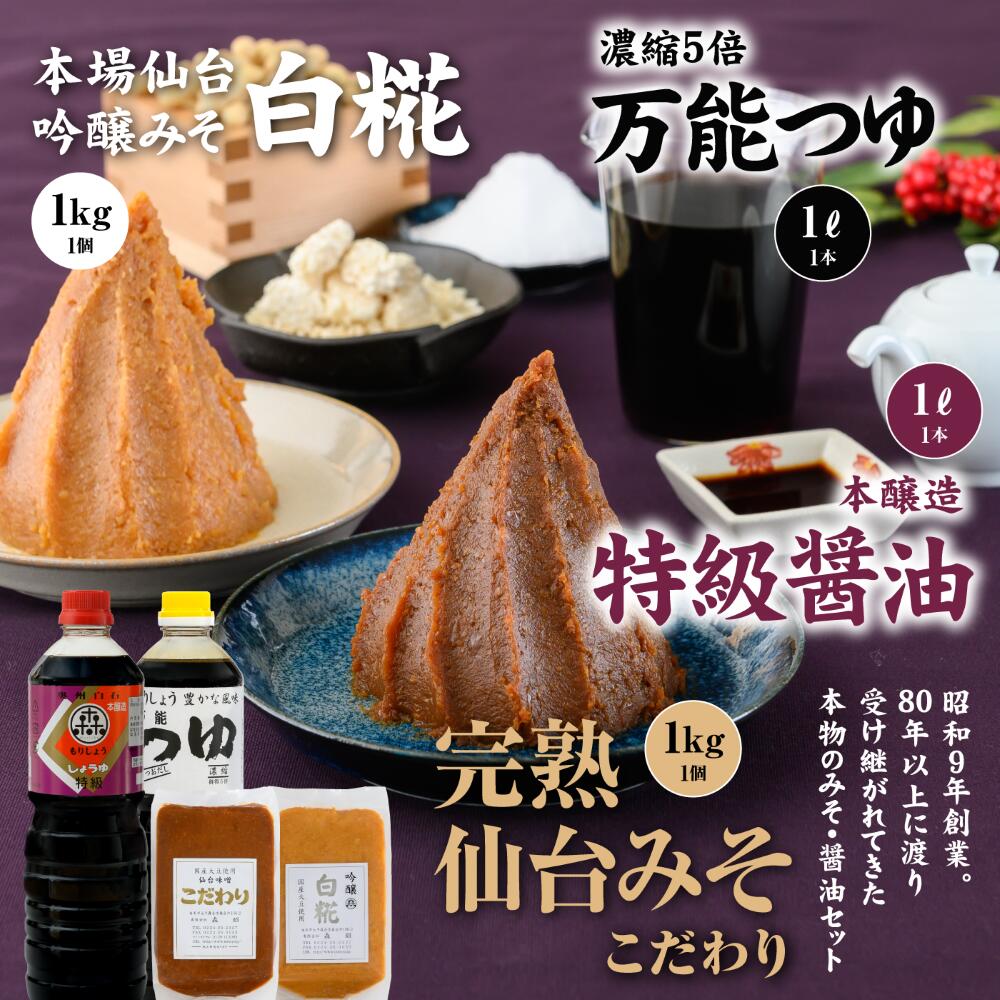 - 【ふるさと納税】 味噌 1kg 吟醸味噌 白糀 1kg 特級醤油 1L 万能つゆ 1L 長期保存 完熟 miso 熟成 長期熟成 米みそ 米味噌 白味噌 吟醸味噌 完熟味噌 本醸造 純正醤油 セット こだわり 老舗 ふるさと納税 宮城県 白石市 白石 【07154】
