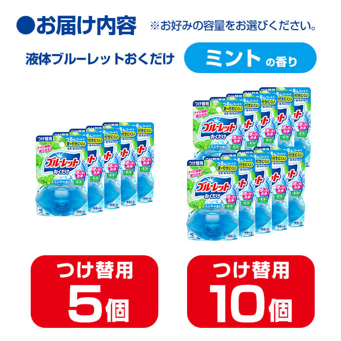 - 【ふるさと納税】液体ブルーレットおくだけ ミントの香り 70ml つけ替用 選べる容量 5・10個 無色の水 小林製薬 ブルーレット トイレ用合成洗剤 トイレ掃除 洗剤 芳香剤 詰め替え 詰替え 付け替え 付替え【CGC】ta445・ta446