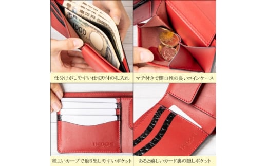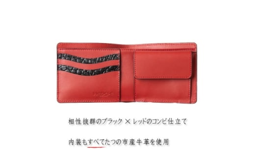- HEDGE ブラッククロコ×レッドの二つ折り財布 たつの市産牛革[クロコ型押しとスムースレザー]【1279359】