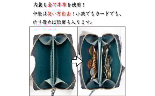 ヌメ革のミニジップウォレット ブルーグリーン[F4570]