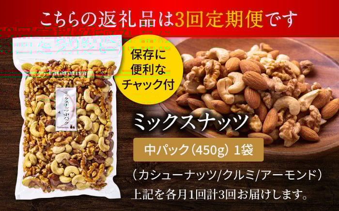 - 【3回定期便】<塩分不使用>ミックスナッツ 中パック 450g【多々楽達屋】tataratiya 無塩 おつまみ おやつ [MAD053]