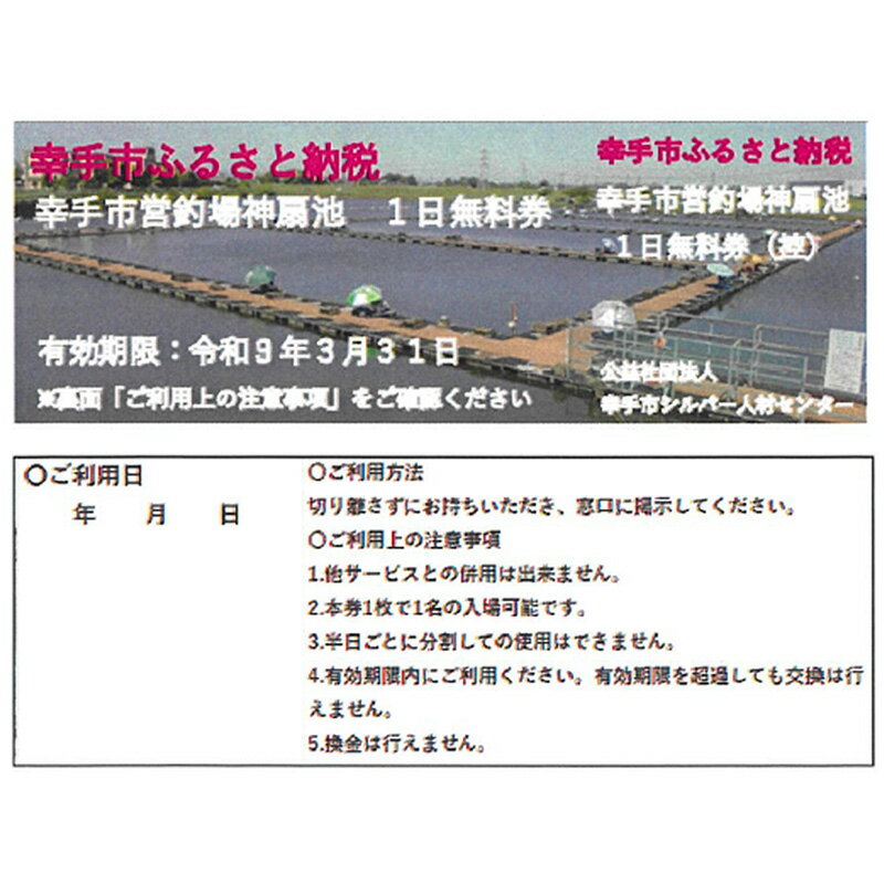 - 【ふるさと納税】幸手市営釣場 神扇池 1日無料券 - 選べる枚数 釣り堀 へら鮒 ヘラ鮒 釣竿 レンタル フィッシング 利用券 チケット シルバー人材センター おすすめ 観光 埼玉県 幸手市
