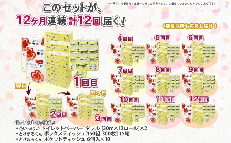 北海道 定期便 12ヶ月連続 トイレットペーパー ダブル ティッシュ ボックス ポケット 花いっぱい とけまるくん ペーパー リサイクル エコ 日用品 雑貨 常備 備蓄 送料無料
