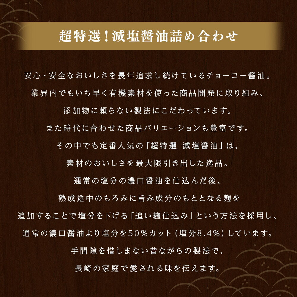 - 【ふるさと納税】超特選! 減塩醤油 詰合せ 900ml×6本 醤油 しょうゆ こいくちしょうゆ しょう油 調味料 こいくちしょうゆ 濃口醤油 濃口 長崎 チョーコー醤油 長崎 セット 詰め合わせ 送料無料