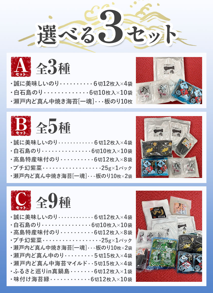 - 【ふるさと納税】海苔 笠岡のりのりセット 選べる Aセット(3種) Bセット(5種) Cセット(9種) はればーじゃ 《45日以内に出荷予定(土日祝除く)》岡山県 笠岡市 海苔 のり 味付のり 岩のり ごはんのお供 食べ比べ
