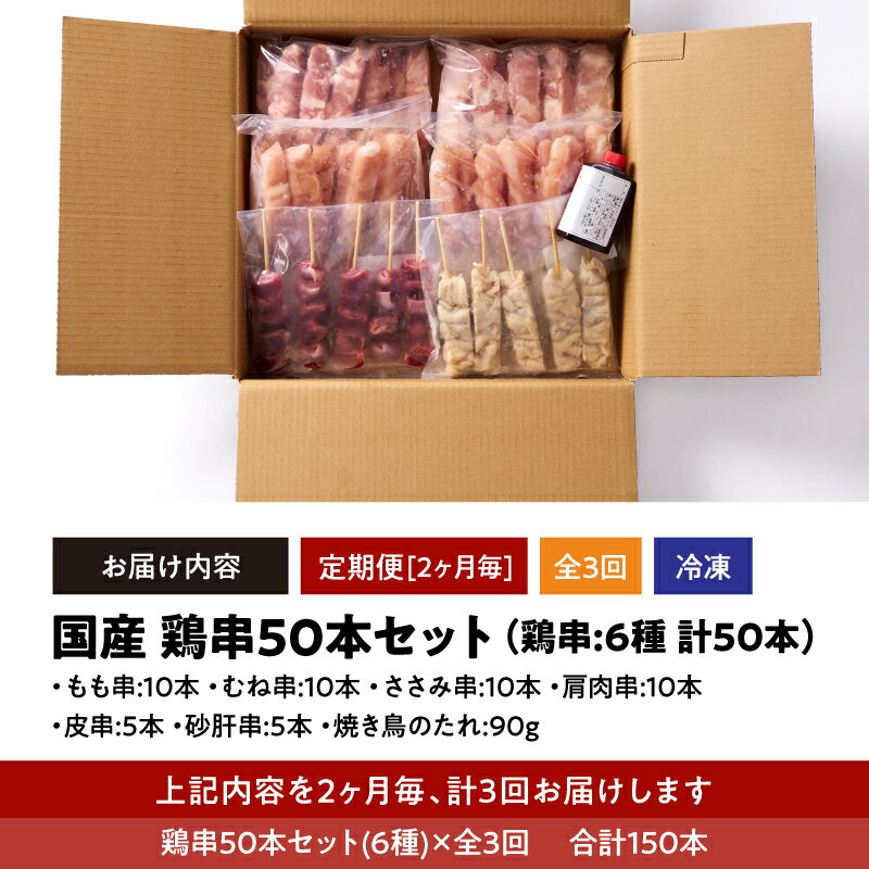 - 【ふるさと納税】【2か月毎定期便】国産 鶏串50本セット 6種×全3回 計150本(鶏もも・鶏むね・ささみ・砂肝・肩肉・鶏皮)定期便 お楽しみ 焼鳥 焼き鳥 鶏肉 やきとり たれ付き 鳥肉 バーベキュー BBQ 惣菜 晩御飯 お弁当 冷凍 急速冷凍 個包装 小分け【株式会社カノミ】