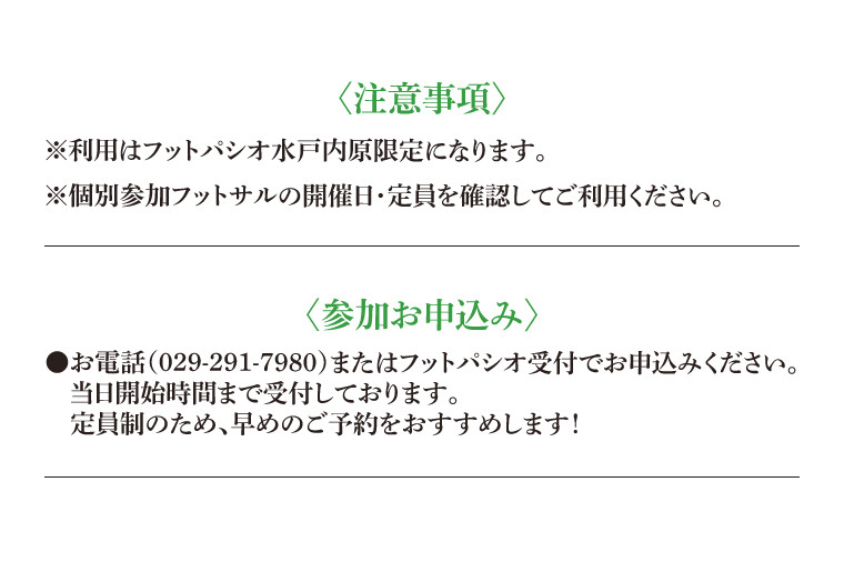 - IB-2 フットパシオ水戸限定 個サル(個人参加フットサル)6ヶ月パス