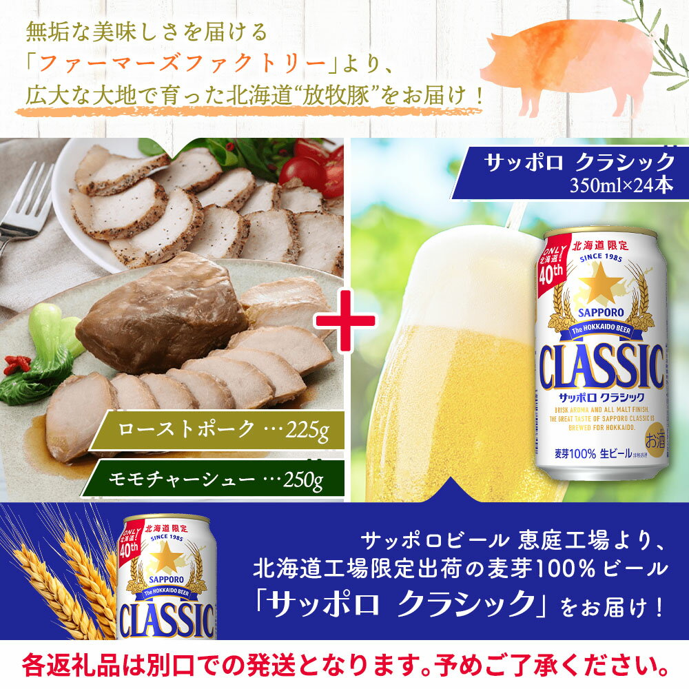 - 【ふるさと納税】モモチャーシュー 225g ローストポーク 250g サッポロクラシック 350ml 24本 コラボ 返礼品 放牧豚 豚肉 モモ ロース サッポロビール クラシック ビール 生ビール ふるさと納税 北海道 恵庭市 恵庭【C99010】
