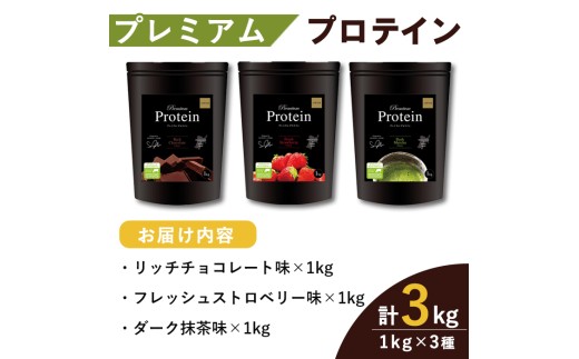 プレミアムプロテイン 3種セット (3種×各1kg) <リッチチョコレート味・フレッシュストロベリー味・ダーク抹茶味> トレーニング 筋トレ タンパク質 常温 水分補給 ドリンク ジム 国内製造 加工食品 【UGOQ株式会社】 tm334