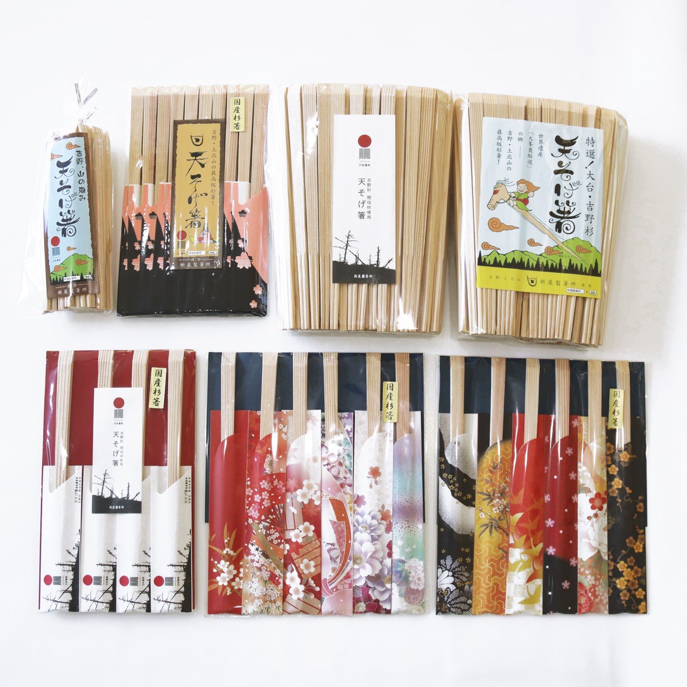 杉の柾目割箸セット(杉九寸天削箸 32膳入包装×2袋・刻印入り杉九寸天削箸 箸袋付5膳組×2袋・えこお杉箸 40本入×3袋)【1-64】
