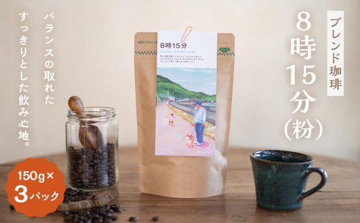 【ブレンド珈琲 8時15分(粉)3パック】ブラジル、グアテマラ、エチオピアブレンド。バランスの取れたすっきりとした飲み心地。