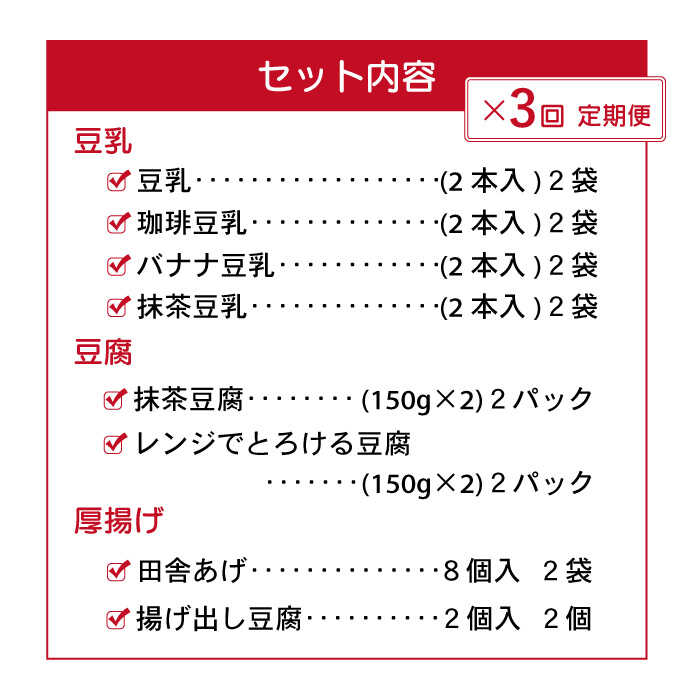 【ふるさと納税】【3回定期便】大屋のこだわり 豆腐 セット(豆腐4パック・豆乳16本・厚揚げ4パック)【大屋食品工業】[OAB019] / とうふ トウフ 抹茶豆腐 揚げ出し 健康 美容 栄養 ヘルシー ダイエット 大豆 ドリンク ソイ デザート おやつ 味噌汁 ご当地グルメ 手作り 黒蜜