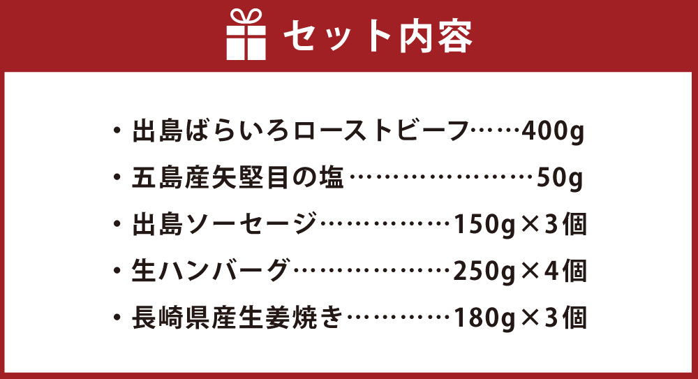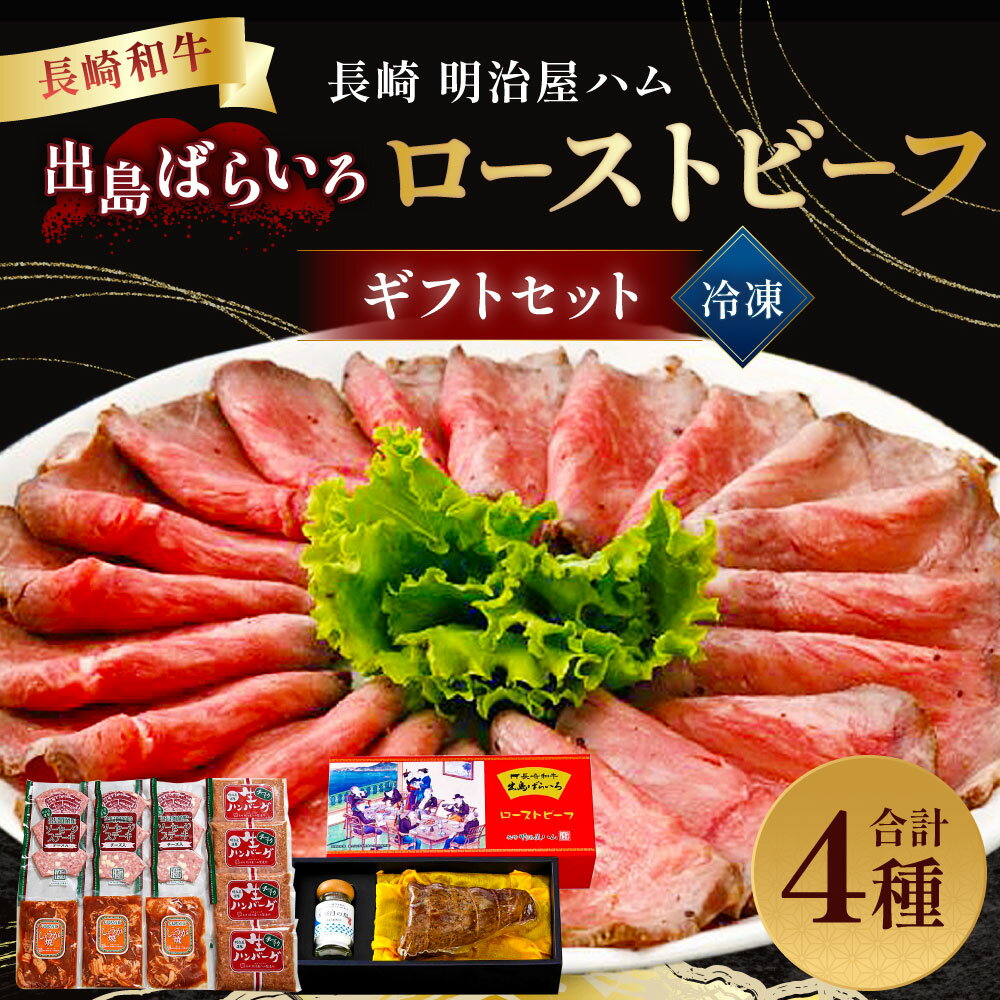 - 【ふるさと納税】【長崎 明治屋ハム】長崎和牛 出島ばらいろローストビーフ(400g)・冷凍ギフト(出島ソーセージ×3・生ハンバーグ×4・長崎県産生姜焼き×3)セット 牛肉 お肉 惣菜 詰め合わせ 贈答 冷凍 長崎県 長崎市 送料無料
