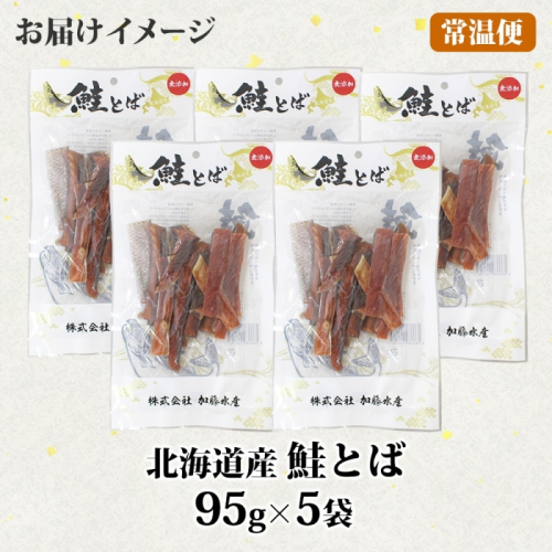 3371. 北海道産 鮭とば 95g 5袋 とば 鮭 秋鮭 シャケとば 干物 歯ごたえ おつまみ 酒の肴 肴 お酒のお供 北の幸 特産品 送料無料 高たんぱく グルメ ギフト お歳暮 加藤水産 北海道 弟子屈町