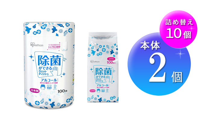 除菌ができるウェットティッシュボトル(100枚入)×2個&詰替え用(100枚入)×10個セット アルコールタイプ WT-100A アイリスオーヤマ 雑貨 日用品 コンパクト 持ち運び 国産