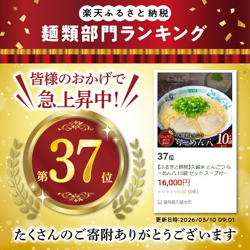 - 【ふるさと納税】久留米 とんこつ らーめん八 10袋 セット スープ付き 半なまラーメン 濃厚 スープ 塩分控えめ 後味スッキリ ラーメン 大人気 半生麺 お手軽 簡単調理 ミシュランガイド掲載 人気店 ご当地グルメ 本場 定番 名物 食品 麺類 九州 福岡県 久留米市 送料無料