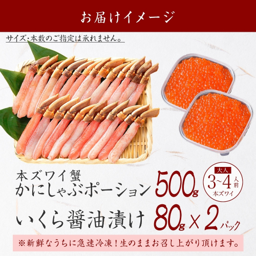 3346.カニ ポーション 蟹 ズワイガニしゃぶ かに ポーション 500g &いくら醤油漬け 80g×2 セット 生食可 カニしゃぶ むき身 蟹しゃぶ ずわい蟹 ずわいがに ズワイガニ カット済 鍋 イクラ いくら 送料無料 北海道 弟子屈町