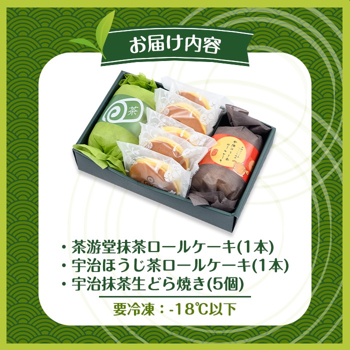 茶彩抄「御園-みその」ロールケーキ2種(抹茶・宇治ほうじ茶)と宇治抹茶生どら焼きセット【茶游堂(ちゃゆうどう)】【uj-AQ005】