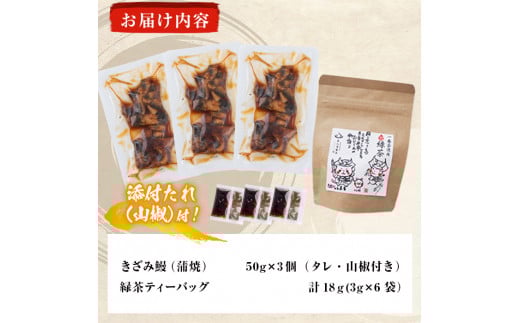 - 【丑の日までに配送】鹿児島県産 きざみ鰻3p(計150g以上)×緑茶セット うなぎ 鰻 ウナギ きざみ鰻 真空パック うな丼 ひつまぶし お茶 茶 緑茶 ティーバッグ セット a1-034-us