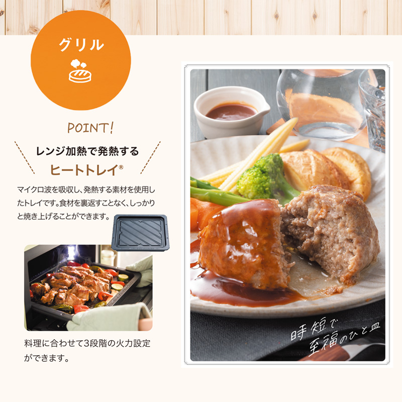 わずか0.2秒で発熱する「グラファイトヒータ」による加熱に、マイクロ波によるレンジ加熱を組み合わせた独自の新技術「グラファイトレンジ加熱」を搭載したオーブンレンジです。こんがりトーストやジューシーなハンバーグ、お惣菜のあたためなども、従来のオーブンレンジの常識を覆す満足感のある仕上がり。「あたため」「レンジ」「解凍」「飲み物」など、シンプルで使いやすい8種の調理メニューも搭載しています。