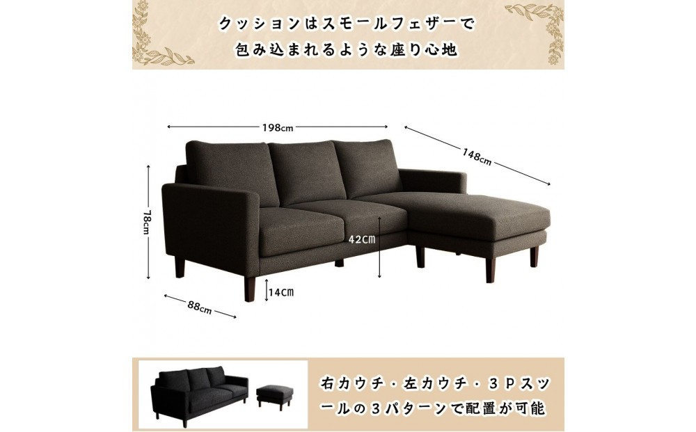 - 【開梱設置】3名掛け CERE 3Pカウチソファ 選べるカラー(Cランク)と脚部素材