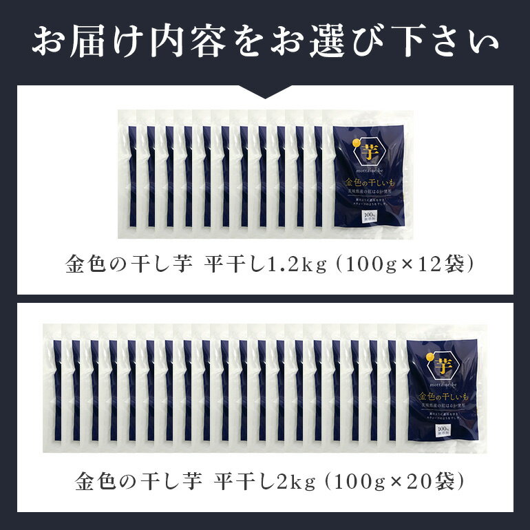 - 【ふるさと納税】 金色の干し芋 平干し 選べる 内容量 1.2kg(100g×12袋) 2kg(100g×20袋) 小分け 干し芋 ほし芋 干しいも スイーツ ダイエット 小分け ギフト プレゼント 国産 茨城県産 紅はるか べにはるか さつまいも サツマイモ お芋 おいも おやつ お菓子 和菓子