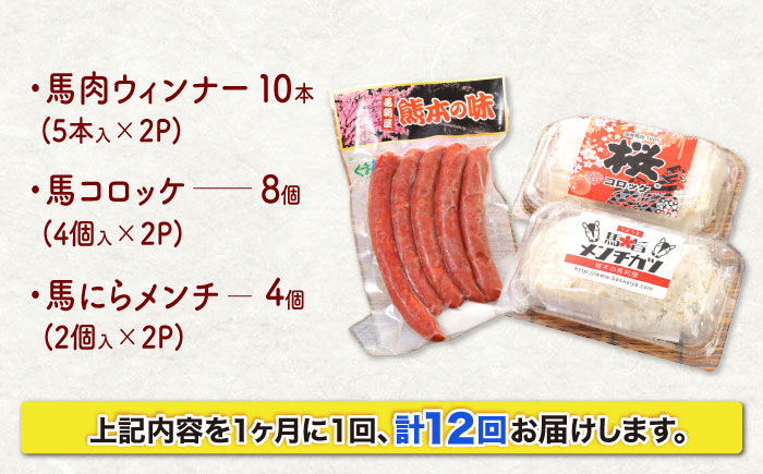 - 【全12回定期便】『純国産』熊本の味「桜」 国産 馬肉 100% お惣菜 3点セット 約1240g ウィンナー コロッケ メンチカツ【有限会社 九州食肉産業】 [AYCN121]