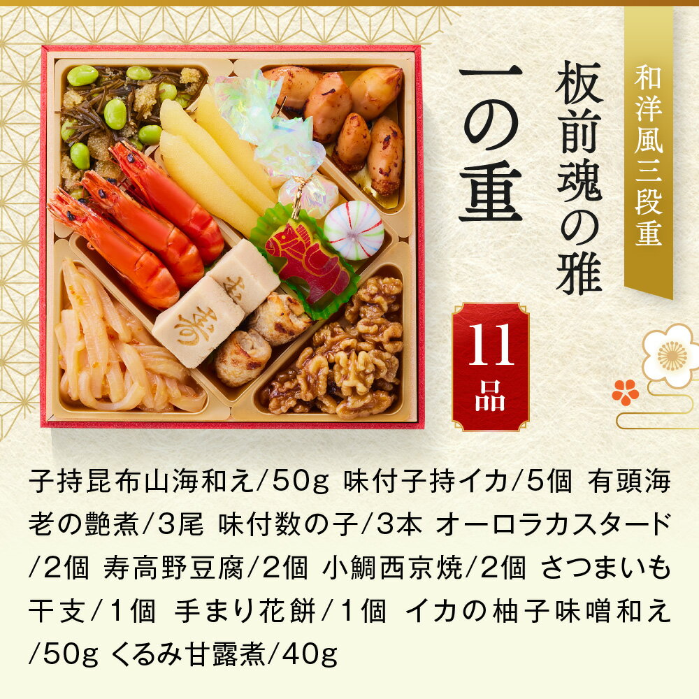 - 【ふるさと納税】「板前魂の雅」和洋風三段重おせち(3人前) 板前魂 おせち料理 お節 和風 洋風 お取り寄せ グルメ お正月 2026 送料無料 人気 食品 冷凍おせち 冷凍 期間限定 先行予約 数量限定 福岡 飯塚市 【D3-010】
