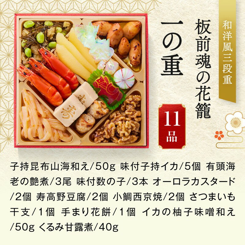 【ふるさと納税】「板前魂の花籠」和洋風三段重おせち(3人前) 板前魂 おせち料理 お節 和風 中華 洋風 お取り寄せ グルメ お正月 2026 加工食品 送料無料 人気 食品 冷凍おせち 冷凍 期間限定 先行予約 福岡 【B7-035】