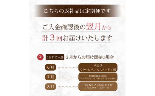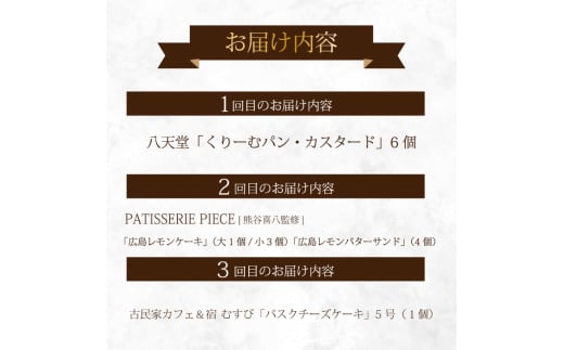 - 【全3回定期便】三原の人気スイーツ 3種食べ比べ お菓子 洋菓子 お取り寄せ ギフト ご褒美 八天堂 むすび ピース T03