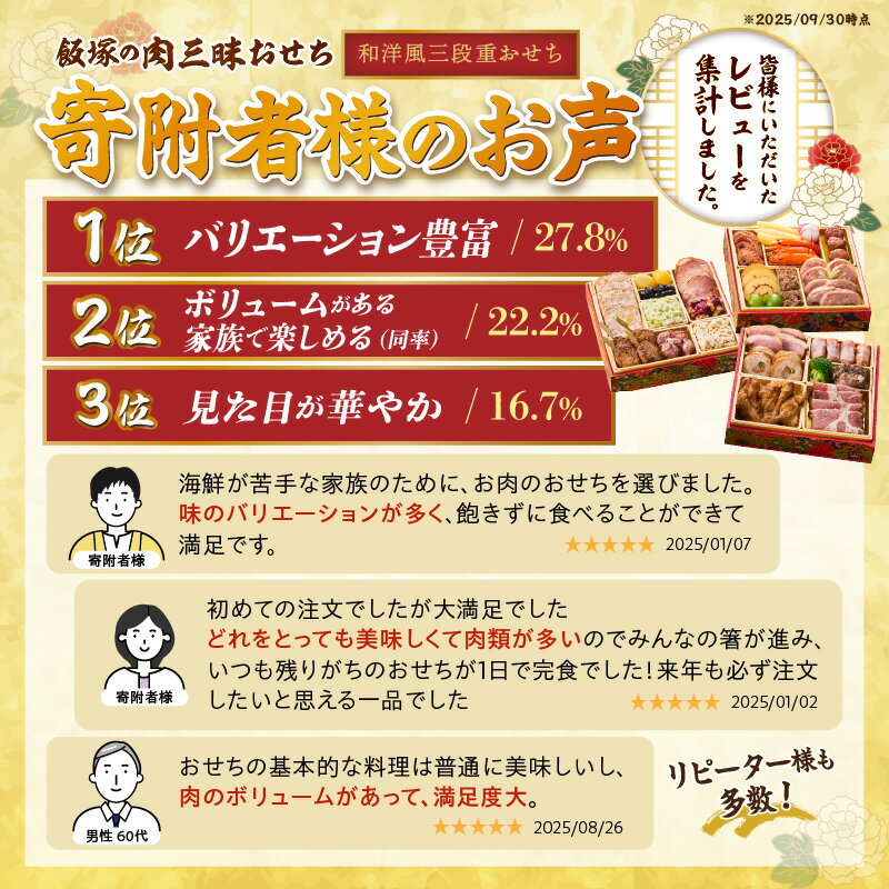 【ふるさと納税】「飯塚の肉三昧おせち」和洋風三段重おせち(3人前) おせち【C1-004】