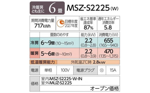 - 三菱電機 エアコン 霧ヶ峰Sシリーズ 25年モデル MSZ-S2225-W(6畳用/100V/ピュアホワイト)【標準設置工事付】【配送不可:沖縄・離島】