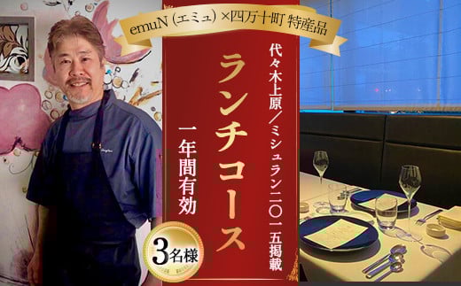 - 【代々木上原/ミシュラン2015掲載】emuN(エミュ)×四万十町 特産品ランチコース 3名様(1年間有効) Smnt-24 ミシュラン 食事チケット 食事券 レストラン チケット ランチ ディナー 利用券 ギフト 贈り物 贈答 父の日 母の日 誕生日