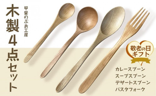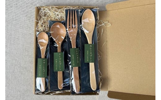 <湯布院・カトラリー専門 甲斐のぶお工房>木製 スプーン・フォーク 4点セット(カレー・スープ・デザート・パスタ用)