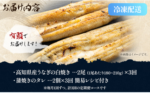 - 【3カ月定期便】高知県産鰻の白焼き180~210g×2尾 合計6尾 エコ包装 - 鰻 ウナギ 有頭 つまみ ご飯のお供 たれ 簡易包装 Wyw-0079