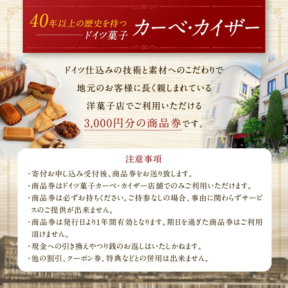 - 【ふるさと納税】ドイツ菓子 カーベ・カイザー店舗で使える商品券(3,000円分) | 西宮 老舗 洋菓子店 ドイツ菓子 専門店 商品券 人気 おすすめ ギフト チケット プレゼント お祝い お取り寄せ 通販 送料無料 ふるさと納税