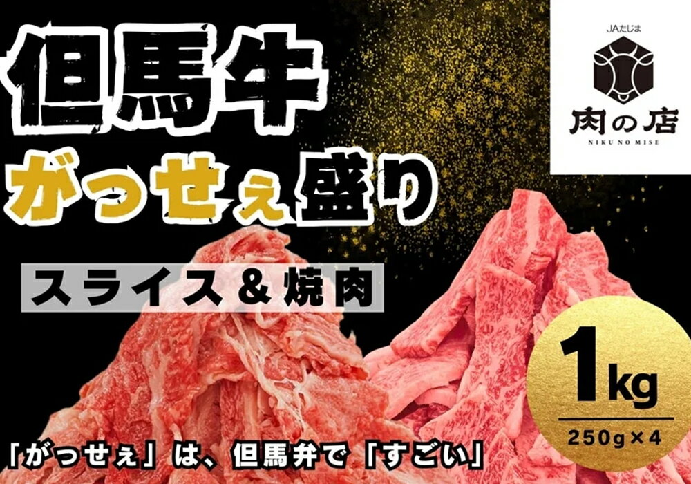 【ふるさと納税】但馬牛 がっせぇ盛り(スライス&焼肉用・1kg)250g 2種 各2パック 合計4パック 小分け 肉 牛肉 お肉 スライス 薄切り 食べ比べ セット 赤身 バラ バラ肉 ばら 国産 黒毛和牛 和牛 焼肉 焼き肉 BBQ お取り寄せ 冷凍 兵庫県 新温泉町 送料無料