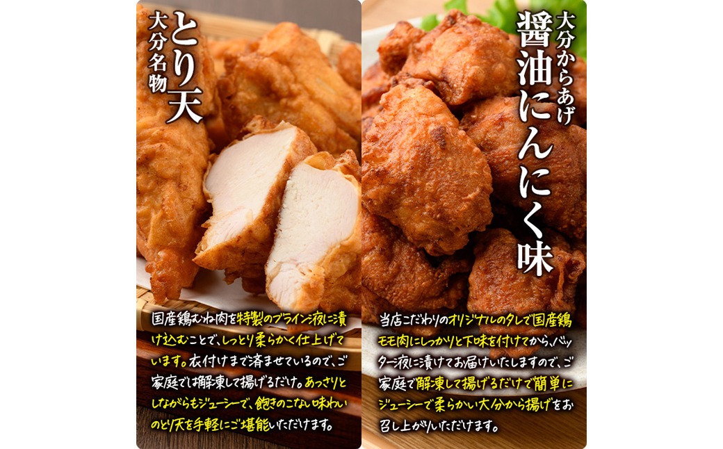 - 時短おかず 揚げるだけ 大分からあげ 醤油にんにく味・とり天セット (計1kg・各500g) 国産 鶏むね肉 鶏もも肉 肉 からあげ 唐揚げ とり天 名物 セット ご当地グルメ 食べ比べ 冷凍 惣菜 お弁当 小分け 簡単 時短 大分県 佐伯市【DH292】【ネクサ】