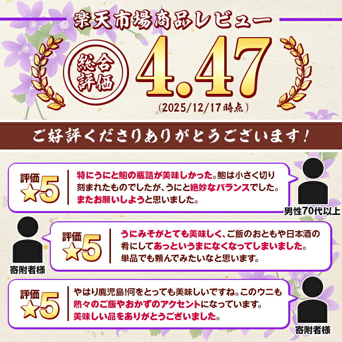 - 【ふるさと納税】\高評価★4.38獲得!/<鹿児島県産うに使用>尾塚水産人気商品!濃厚うにの瓶詰め(3本)国産 鹿児島県産 雲丹 ウニ 魚介 魚貝 海産物 海鮮丼 瓶詰 アワビ 鮑 小分け セット 冷蔵配送 刺身 海鮮丼【尾塚水産】akn004-04