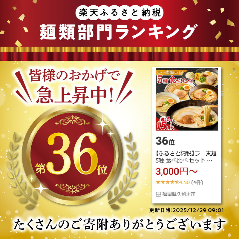 - 【ふるさと納税】ラー麦麺 5種 食べ比べ セット 久留米豚骨 博多豚骨 味噌 醤油 塩 選べる 内容量 5食 ~ 15食 ラーメン スープ 麺 コシ 強い 歯切れ 色 細麺 茹で時間 1分ほど 麺 麺類 お取り寄せ 福岡県 久留米市 送料無料