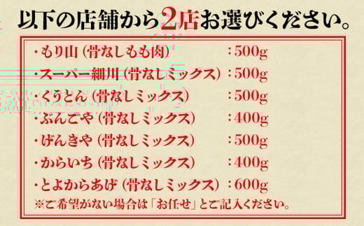- 中津からあげ2店堪能セット | 家庭調理 味付生肉 中津からあげ 唐揚げ からあげ から揚げ レンジ 冷凍 冷凍食品 もり山 スーパー細川 くうとん ぶんごや げんきや からいち とよからあげ 大分県 中津市