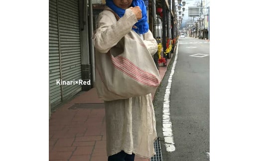 - 織物のワンマイルバッグ エコバッグ (本牛革製ハンドル付き) キナリ×レッド