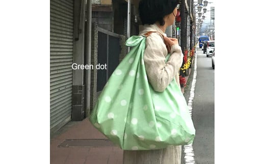 織物のワンマイルバッグ エコバッグ (本牛革製ハンドル付き) グリーン×水玉