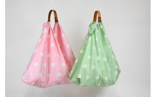 - 織物のワンマイルバッグ エコバッグ (本牛革製ハンドル付き) グリーン×水玉