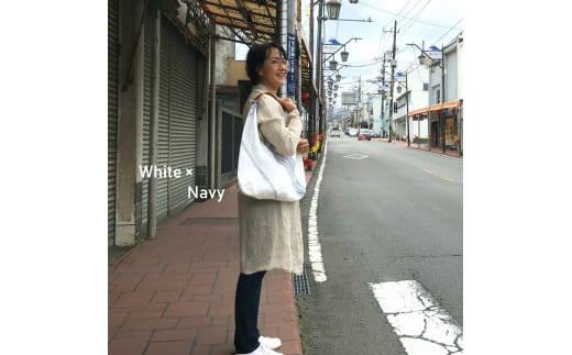 織物のワンマイルバッグ エコバッグ (本牛革製ハンドル付き) ホワイト×ネイビー