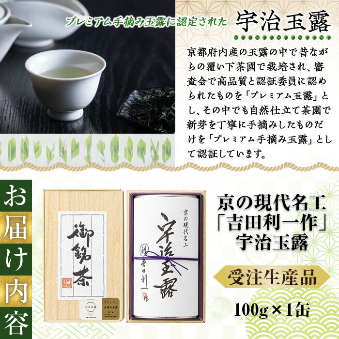 - 【ふるさと納税】<受注生産品>《森半》京の現代名工「吉田利一作」宇治玉露(100g) 銘茶 お茶 宇治茶 緑茶 玉露 手摘み 吉田利一 プレミアム玉露 手摘み玉露 高級玉露 茶葉缶入り 宇治産玉露 京都玉露 老舗茶舗 高級緑茶 【uj-AR003】【森半】