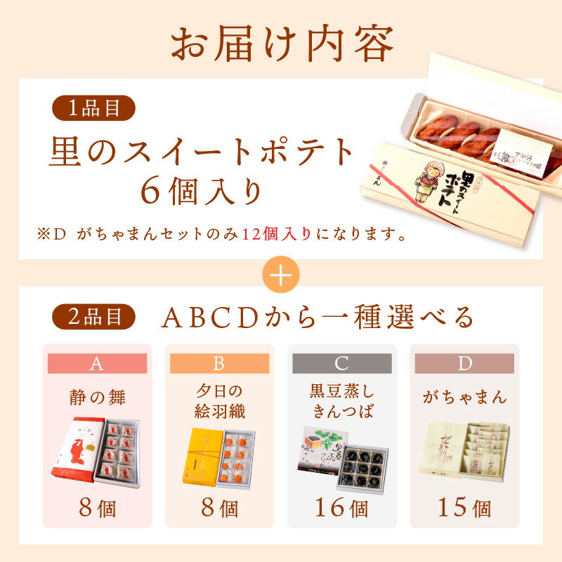 【ふるさと納税】里のスイートポテト+選べるスイーツセット 静の舞(8個入) 夕日の絵羽織(8個入) がちゃまん(15個入)黒豆蒸しきんつば(16個入)選べる セット ギフト 和菓子 いも スイートポテト スイーツ プレゼント お返し 贈り物 誕生日 手土産 スイーツ