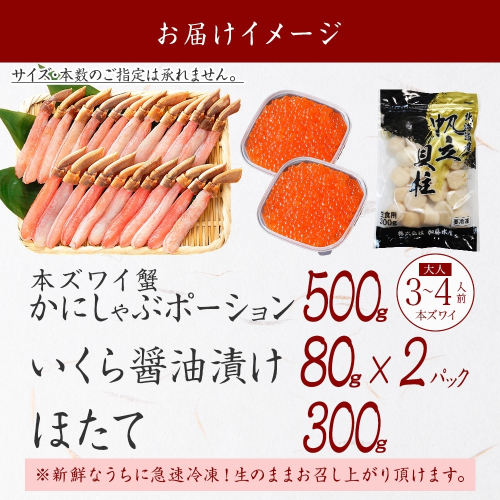 3325. カニ 蟹 ズワイガニ しゃぶ 500g いくら醤油漬け 80g×2 ホタテ貝柱 300g 豪華 セット 生食 可 カニしゃぶ かにしゃぶ ズワイ蟹しゃぶ ずわい蟹肉 ずわいがに イクラ 帆立 ほたて 送料無料 北海道 弟子屈町
