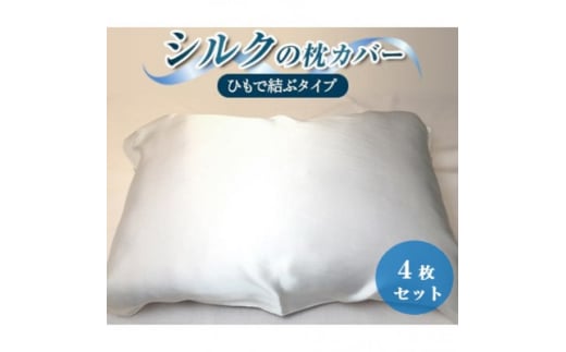 <シルクの枕カバー>×4枚 ひもで結ぶタイプ フリーサイズで大きな枕にも対応 白 無添加 ヘアケアに【1631530】